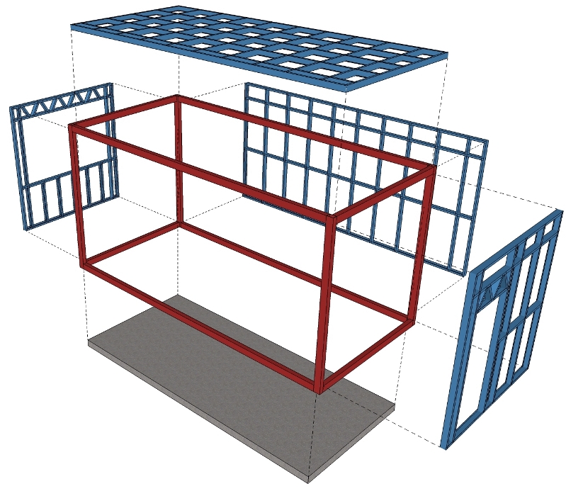 Our walls and floors complements hot-rolled(shown in Red) steel posts very well as secondary framing. Walls, floors and ceilings(shown in Blue) can be pre-cut to designated lengths or prefabricated for easy assembly.
